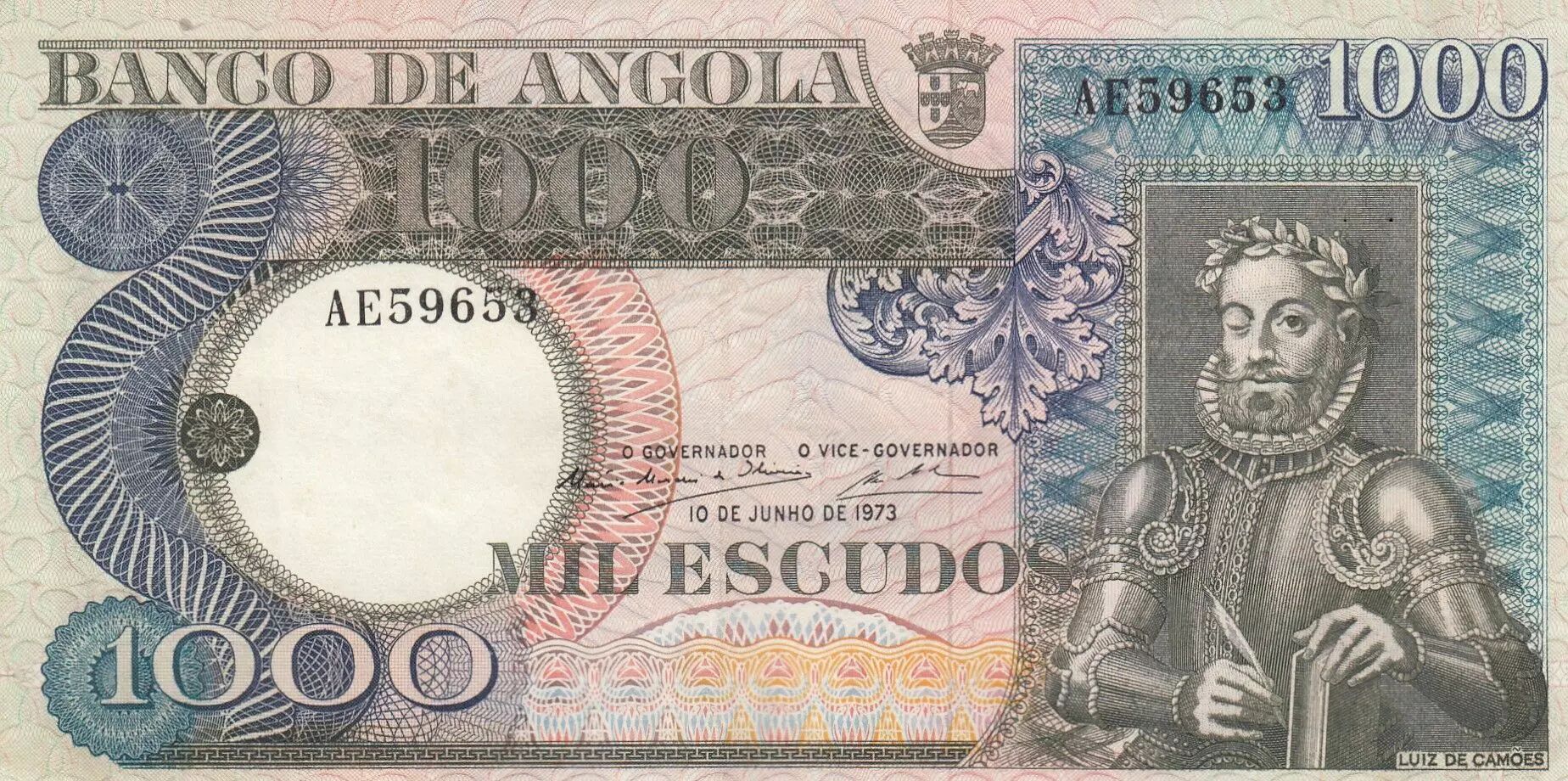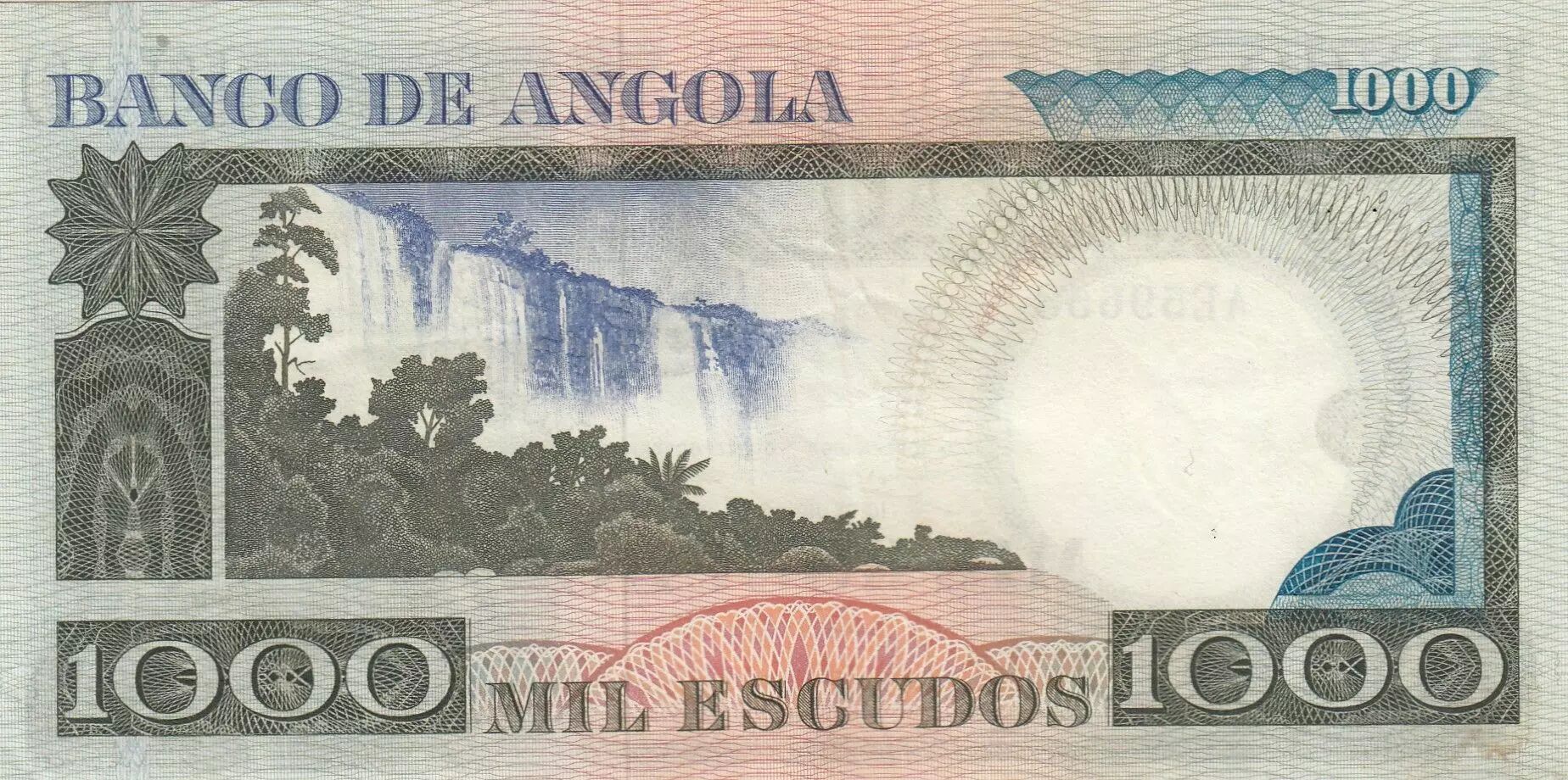 Home > World Banknotes > African Banknotes > Angola > Angola 1000 Escudos - L. de Camoes - Waterfalls - 10-06-1973 - Serial AE