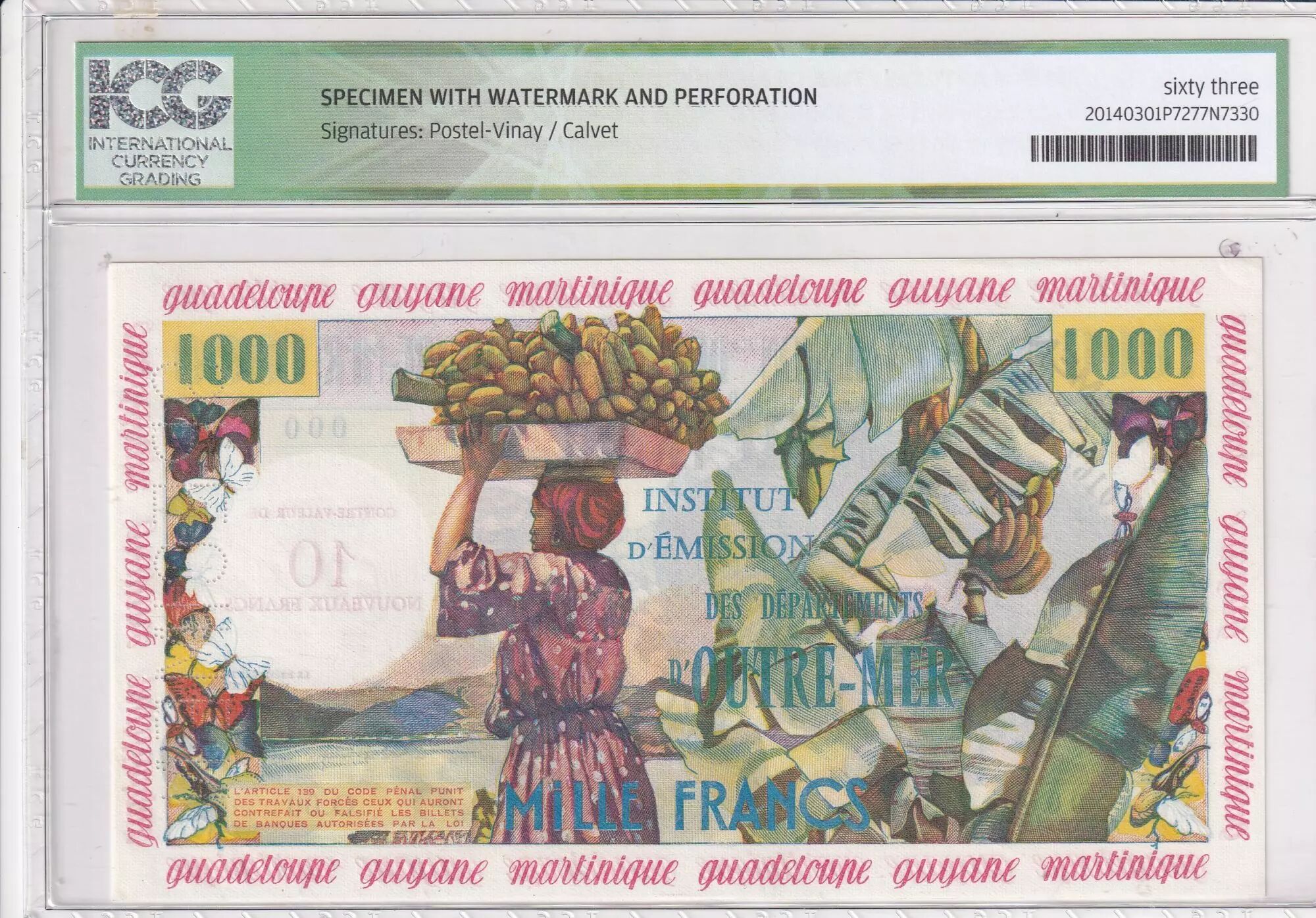 Ce billet, certifié ICG63, présente une surcharge de 10 nouveaux francs, une mesure adoptée après la réforme monétaire de 1960 en France, qui visait à remplacer les anciens francs par les nouveaux francs pour simplifier le système monétaire. La surcharge sur un billet de 1000 francs souligne la transition économique et la réévaluation monétaire de l'époque.