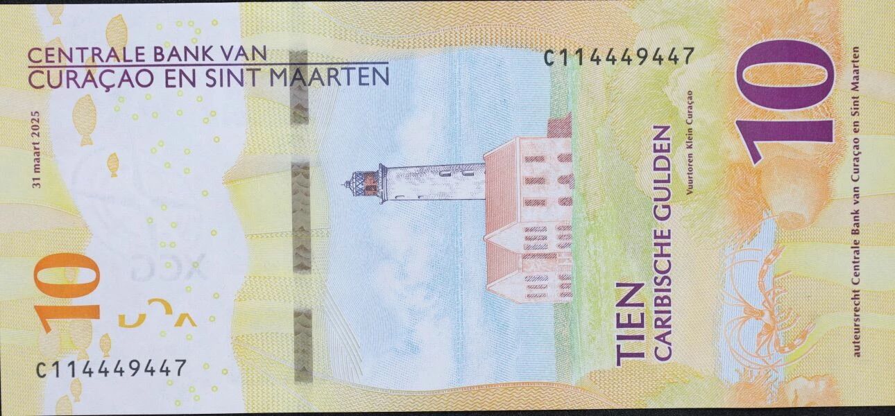 Ce billet de 10 gulden des Antilles Néerlandaises, daté de 2025, appartient à la Série C. Il mesure 147 mm de long et 66 mm de large.