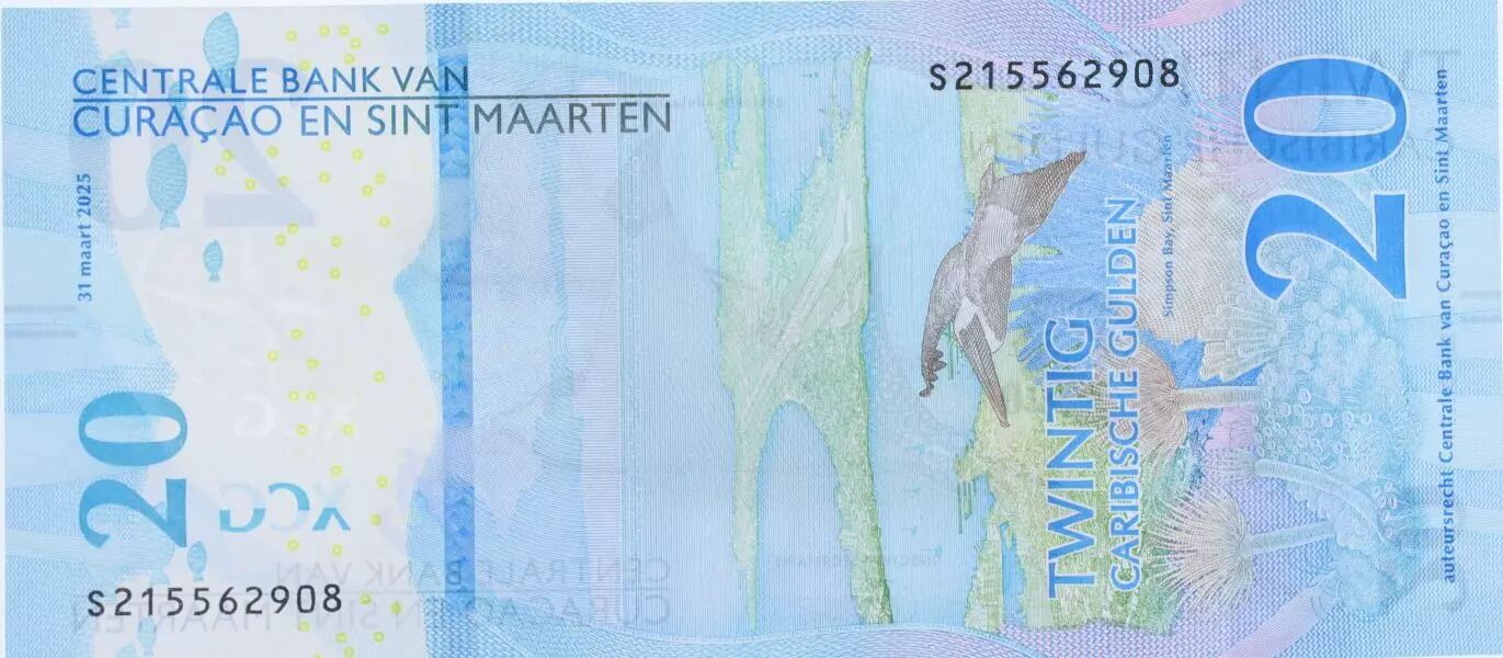 Ce billet de banque est émis par la Banque Centrale de Curaçao et Saint-Martin, avec une valeur nominale de 20 gulden. Il appartient à la série S2 et est daté de 2025.