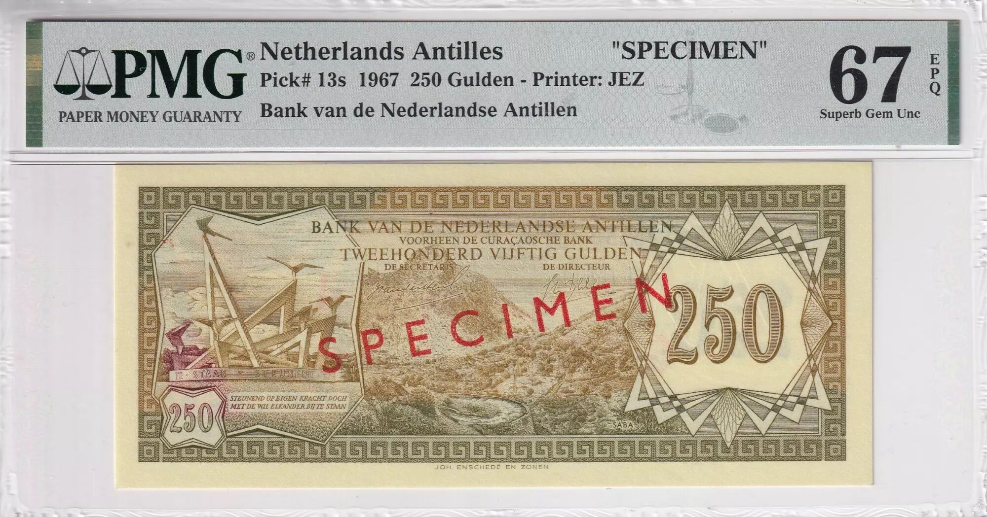 Billet Antilles Néerlandaises 250 Gulden - Paysage - Armoiries - 1967 - Spécimen - PMG 67 EPQ - P.13s