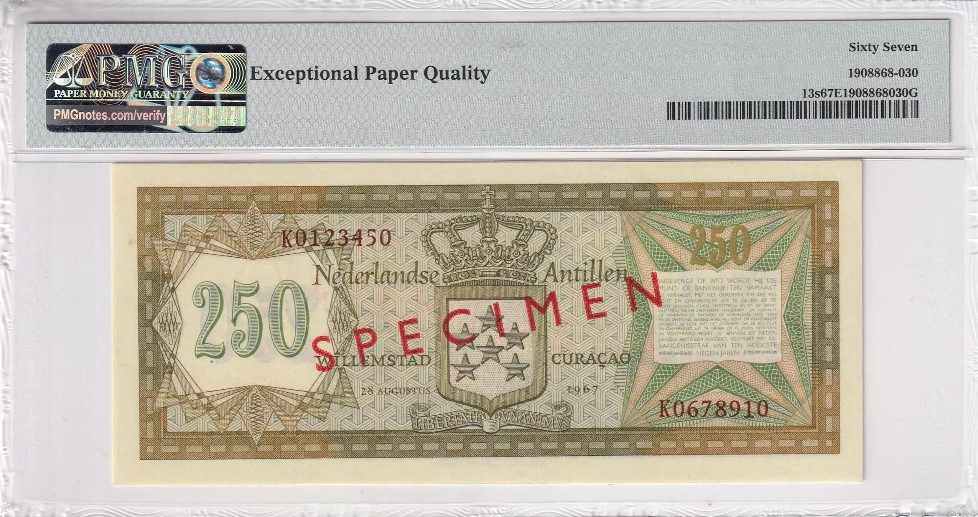 Accueil > Archivage > Antilles Néerlandaises 250 Gulden - Paysage - Armoiries - 1967 - Spécimen - PMG 67 EPQ - P.13s