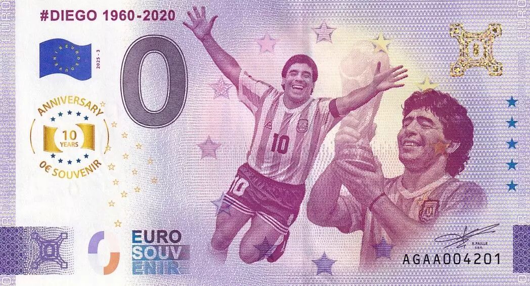 This souvenir banknote, issued in 2025, commemorates Diego Maradona (1960-2020). It is a tourist banknote, with no real monetary face value, designed to be collected or as a souvenir.