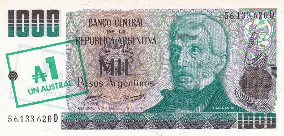 This banknote, with a face value of 1 austral, was issued in Argentina in 1985. It is a banknote from the D series, part of the current production of the Federal Republic of Argentina during the period from 1985 to 1991, when the austral was the currency in circulation.