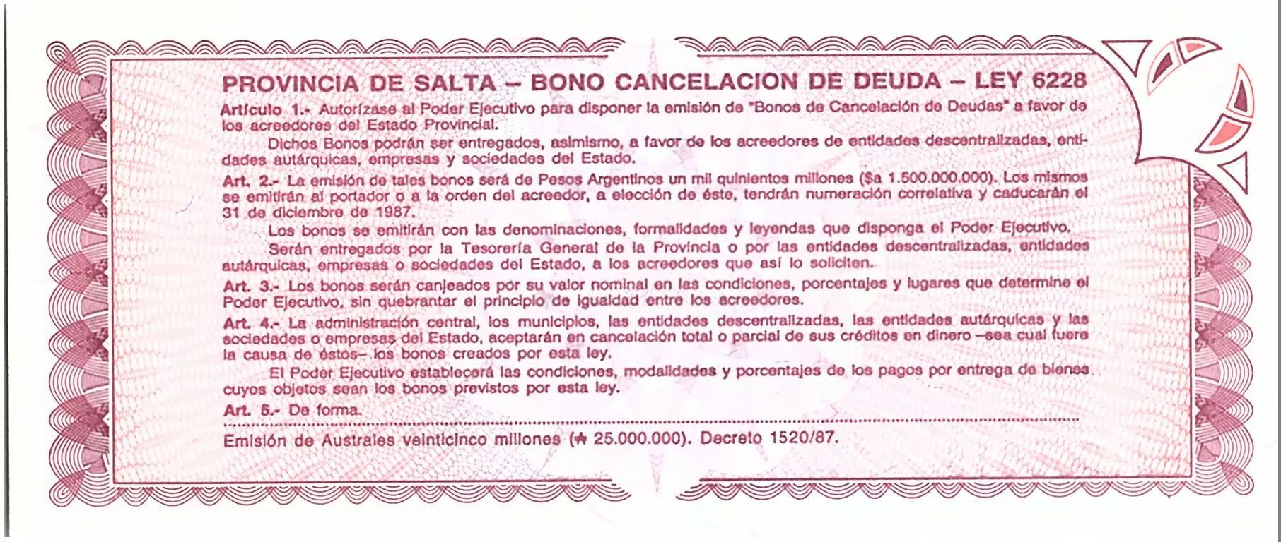 Banknote Argentina 1 austral , Province of Salta - 1987