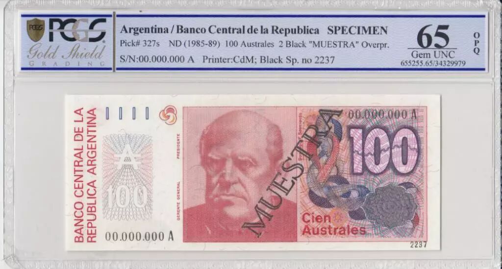 Home > World Banknotes > American Banknotes > Argentina > Argentina 100 Australes - 1985 - Specimen - PCGS 65 OPQ P.327