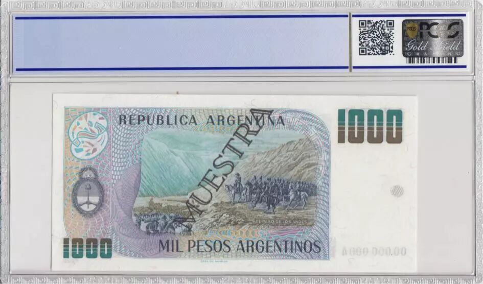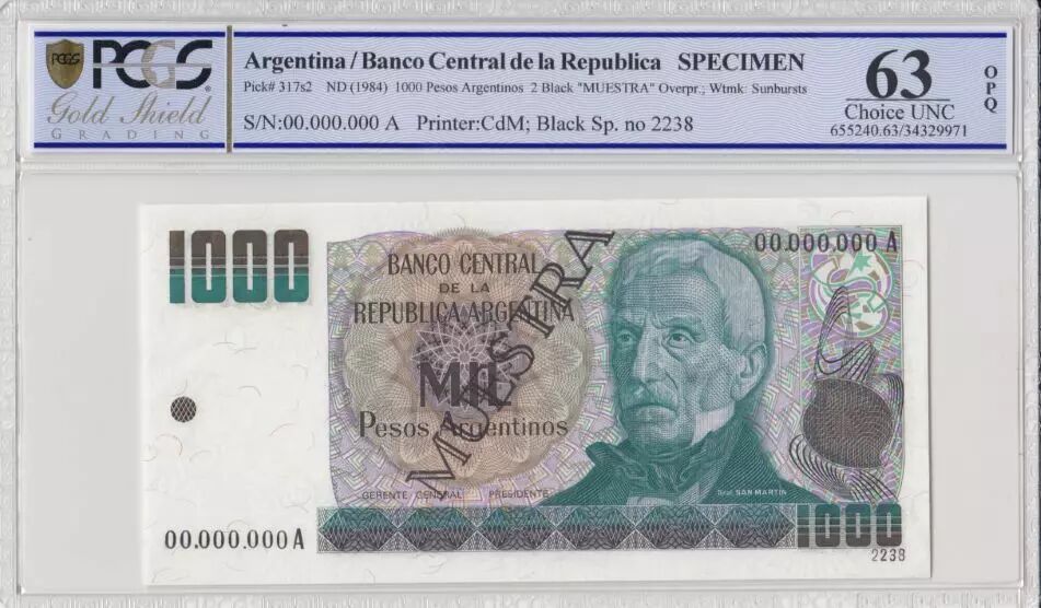 Home > World Banknotes > American Banknotes > Argentina > Argentina 1000 Pesos , G San Martin - 1983 - Specimen - PCGS 63 OPQ -P.317s