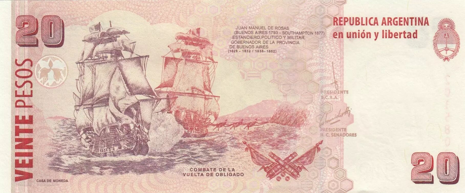 On the back, the banknote features an illustration based on the painting "Combate - La Vuelta de Obligado", commemorating an Argentine historical event. It also reads "REPUBLICA ARGENTINA" as well as the motto "en unión y libertad". A more detailed inscription provides biographical information about Juan Manuel de Rosas, indicating that he was an "Estanciero, Politico y militar, gobernador de la provincia de Buenos Aires (1829-1832 / 1835-1852)" and specifying his dates of birth and death (Buenos Aires 1793 - Southampton 1877). The name of the battle, "COMBATE DE LA VUELTA DE OBLIGADO", is also mentioned.