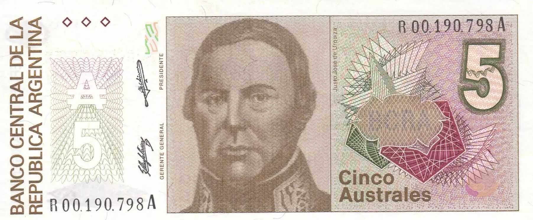 Home > World Banknotes > American Banknotes > Argentina > Argentina 5 Australes - Justo Jose De Urquiza - 1987-1989 - Serial of replacement