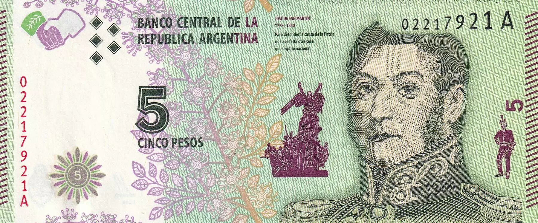 Banknote Argentina 5 Pesos - J. San Martin - Bolivar, Mendoza, Artigas - ND (2015) - Serial A - P.359