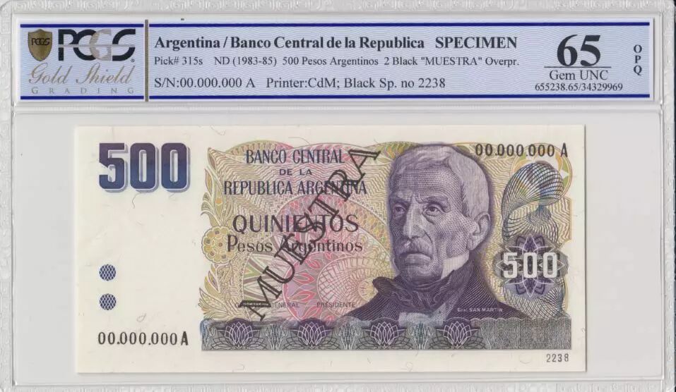 Home > > Argentina 500 Pesos, G San Martin - 1983 - Spécimen - PCGS 65 OPQ - P.316s