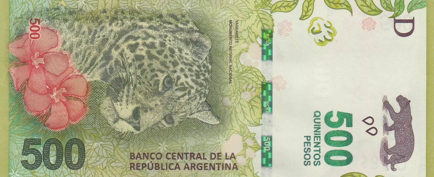 The front of the banknote features a jaguar (Panthera onca) and a flower. It also includes inscriptions in Spanish: "QUINIENTOS PESOS" (five hundred pesos), "BANCO CENTRAL DE LA REPÚBLICA ARGENTINA" (Central Bank of the Argentine Republic) and "YAGUARETÉ MONUMENTO NATURAL NACIONAL" (Jaguar National Natural Monument). The script used is Latin.