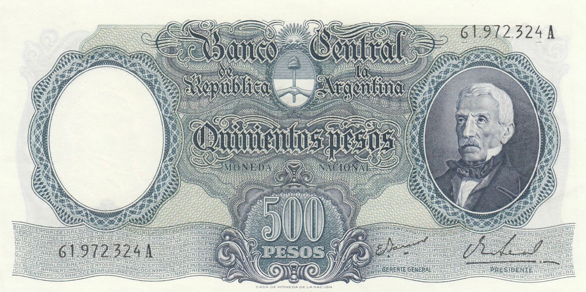This banknote is an issue of the Argentine Republic, with a face value of 500 pesos. It is part of a series issued between 1964 and 1969, identified as Series A. The banknote does not bear a specific issue date (ND).