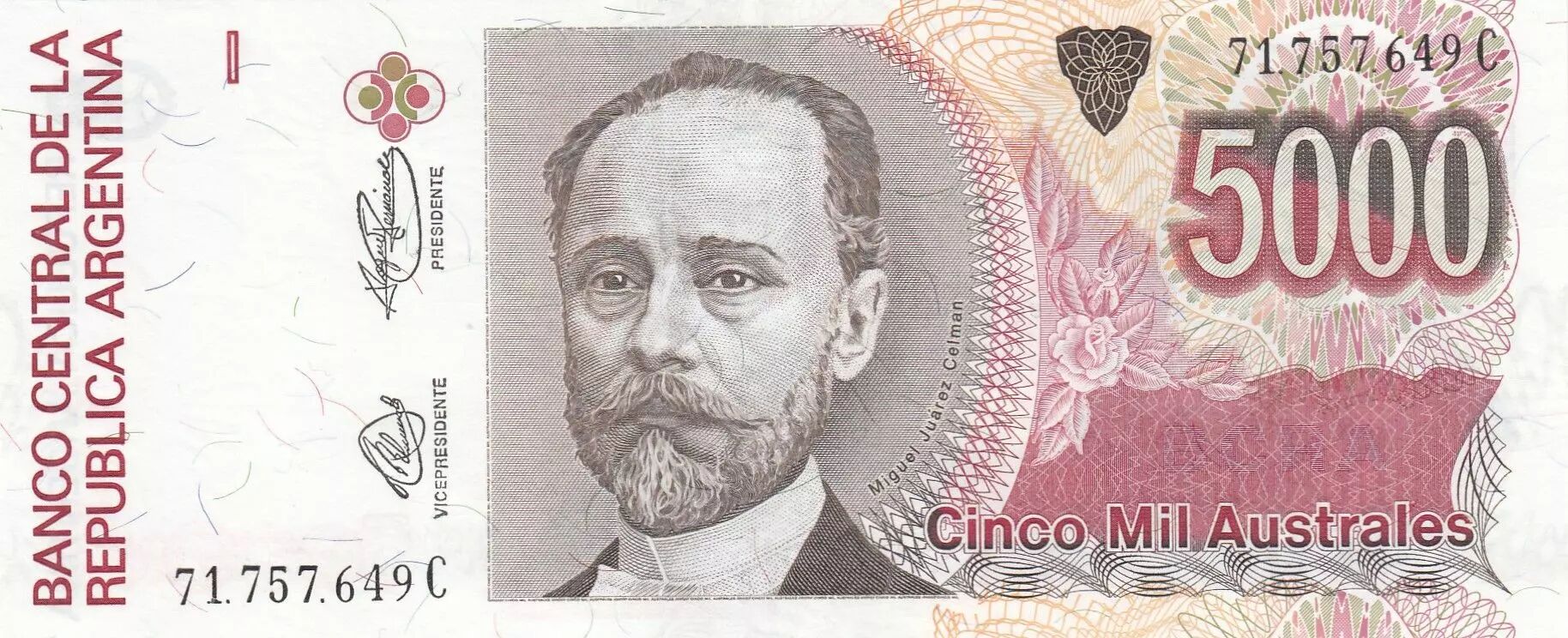 The 5000 Argentine Australes banknote, issued between 1989 and 1991, belongs to series C. This commemorative banknote highlights important figures and symbols of Argentine history and identity.