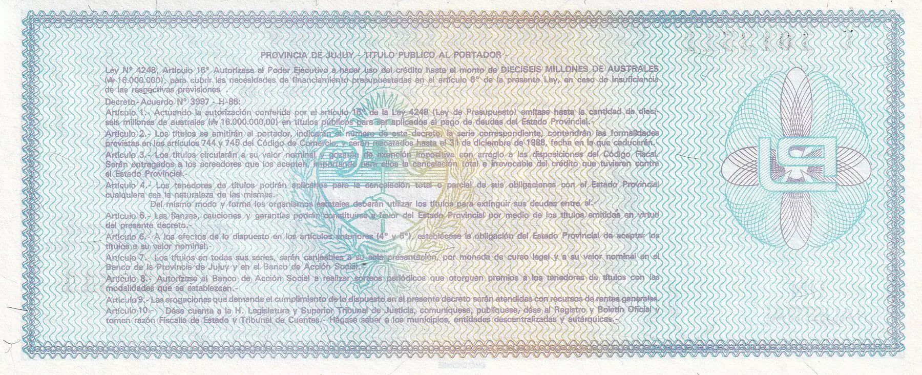 Accueil > Archivage > Argentine 1 Austral - Province de Jujuy - 1988 - Série C - P.S2403