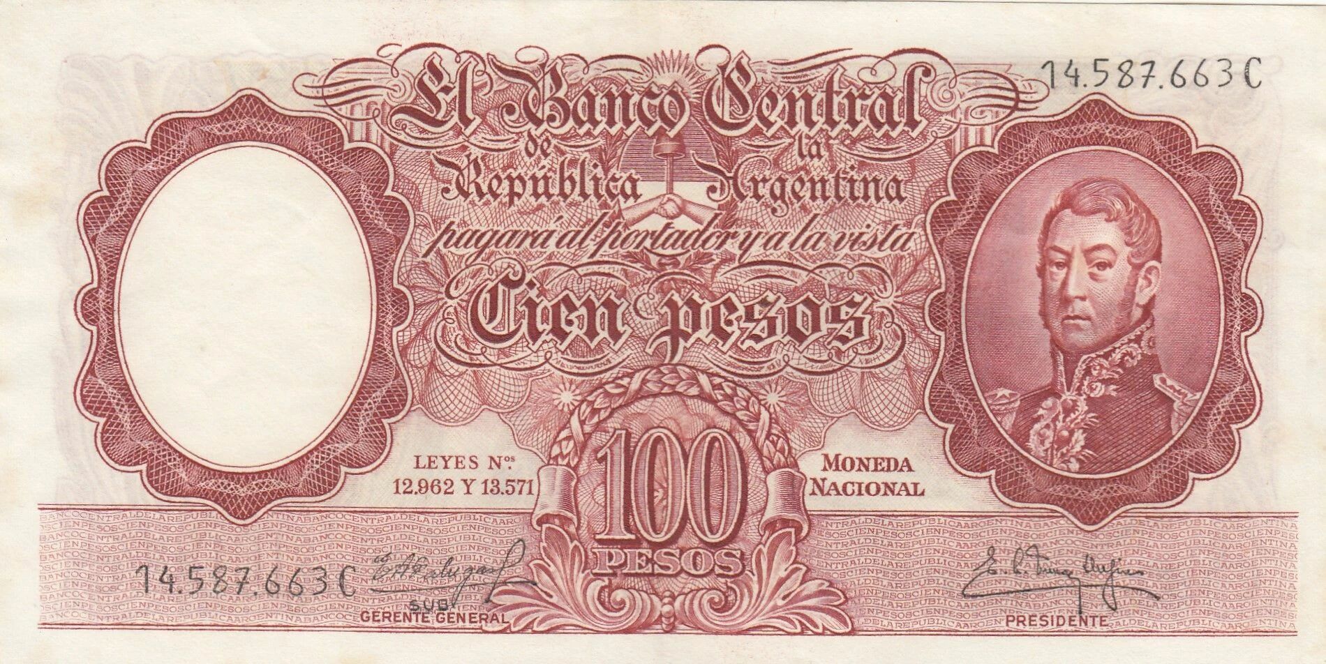 Le recto du billet est de couleur rouge-brun. Il présente un portrait de José de San Martín, représenté en uniforme, positionné sur la partie droite du billet. Les inscriptions en lettres latines incluent le nom de la banque émettrice, "El Banco Central de la República Argentina", ainsi que la promesse de paiement "pagará al portador y a la vista Cien pesos". On y trouve également la mention des lois "LEYES Nº 12.962 Y 13.571" et la désignation "MONEDA NACIONAL" suivie de la valeur "100 PESOS".