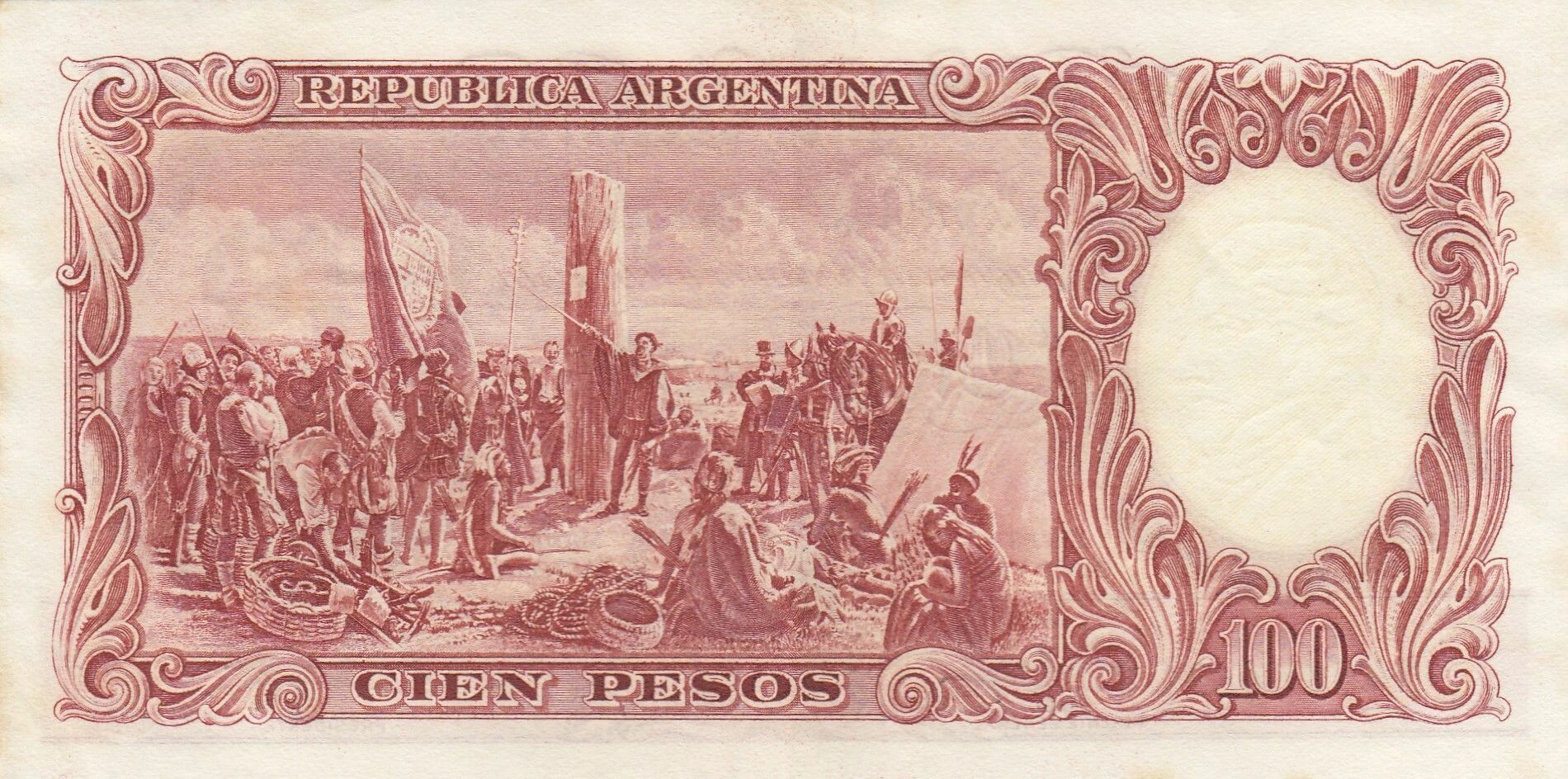 Le verso du billet, également de couleur rouge-brun, arbore une illustration représentant des Espagnols et des Indiens. Cette illustration est une reproduction de la peinture "Deuxième fondation de Buenos Aires" de José Moreno Carbonero. Les inscriptions en lettres latines comprennent "Republica Argentina" et la valeur nominale "Cien Pesos 100".