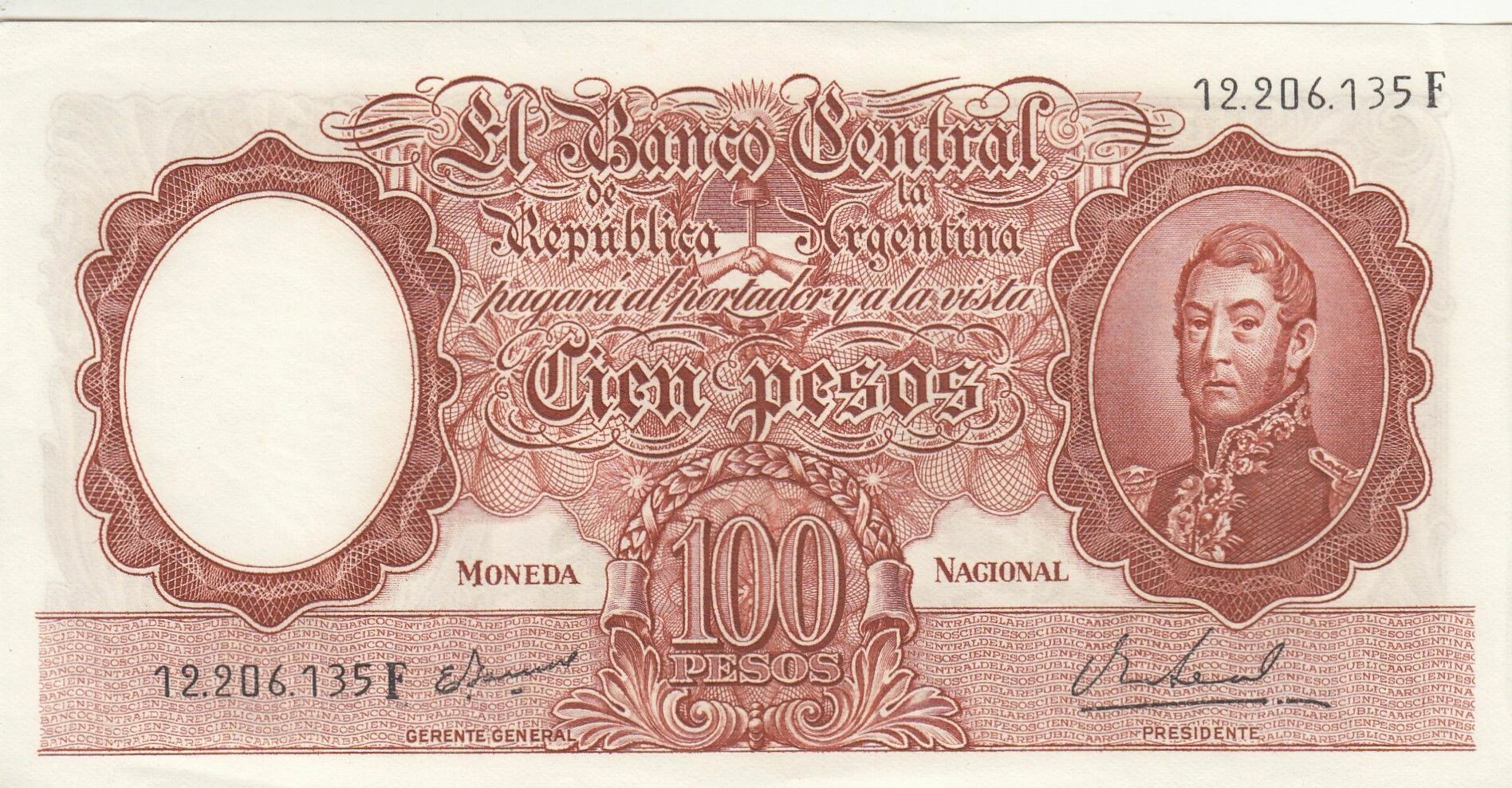 Au recto, le billet arbore une teinte rouge-brun dominante. On y trouve un portrait de José de San Martín, figure emblématique de l'indépendance argentine, représenté en uniforme. Les inscriptions suivantes sont présentes : "Banco Central de la República Argentina", indiquant l'institution émettrice, suivi de la mention "pagará al portador y a la vista", signifiant que la banque centrale paiera au porteur sur demande. La valeur nominale de "Cien Pesos" est également inscrite, accompagnée de la désignation "Moneda Nacional".