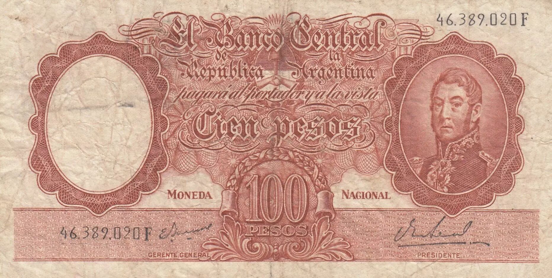 Accueil > Archivage > archivage-Billets du Monde > Argentine 100 Pesos - José de San Martín - ND (1954-1968) - Série F