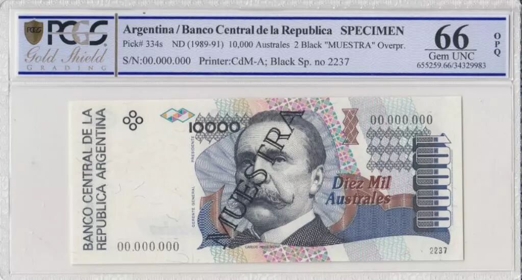 Billet Argentine 10000 Australes , C Pellegrini - 1989 - Spécimen - PCGS 66 OPQ