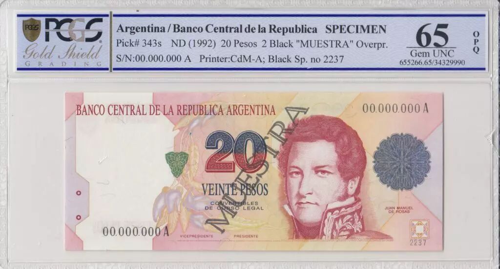 Billet Argentine 20 Pesos Jean Manuel de Rosas - 1992 - Spécimen - PCGS 65 OPQ