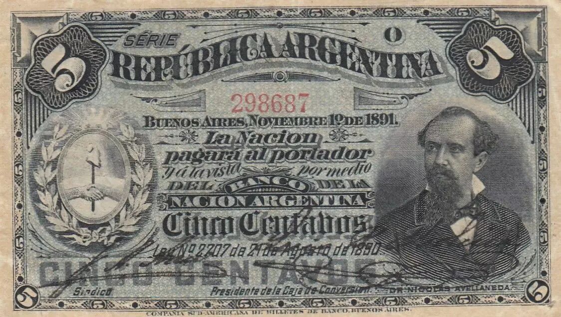 Billet Argentine 5 Centavos - Nicolas Avellaneda - 1897 - Série O