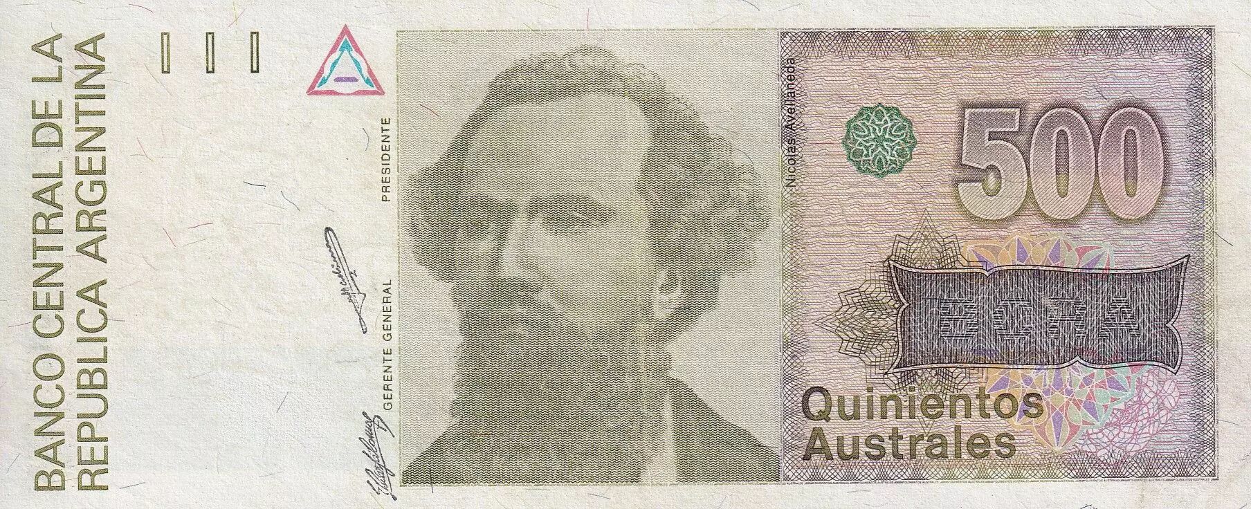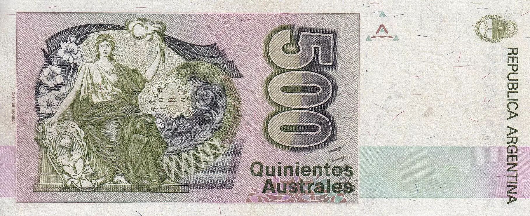 Une partie du numéro de série se situe à l'avers, en diagonale entre "500" et "Quinientos australes".