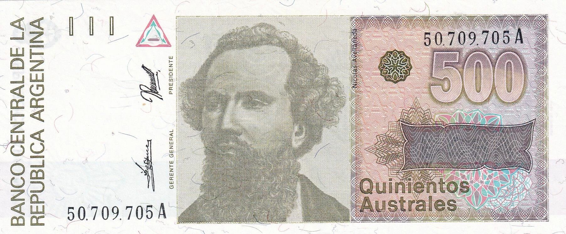 Le billet commémore Nicolás Avellaneda, une figure historique argentine. Le design du billet intègre un portrait de Nicolás Avellaneda, probablement basé sur des photographies ou des peintures existantes. L'orientation du portrait et son emplacement sur le billet contribuent à l'esthétique générale du design.