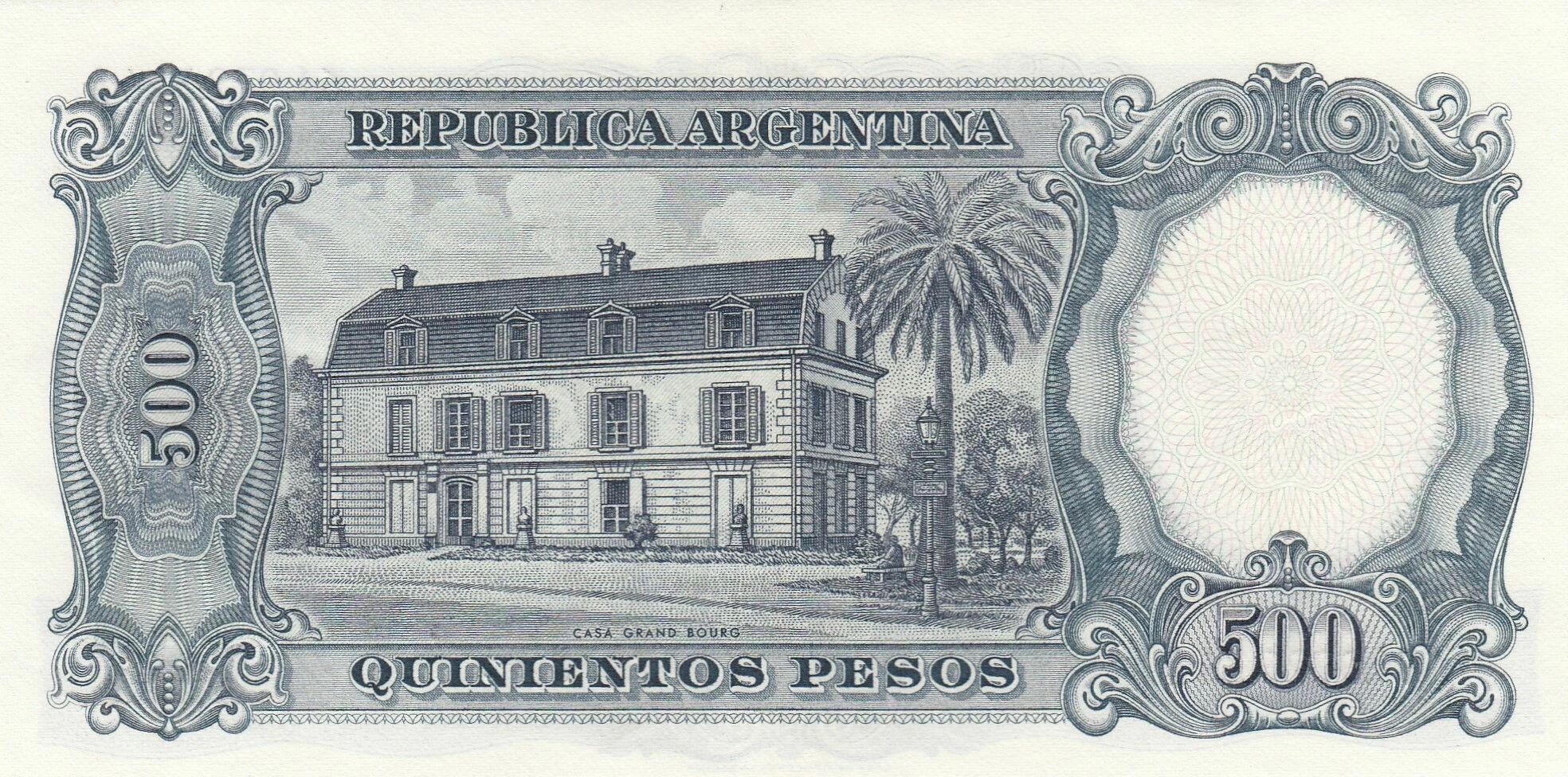 Ce billet de banque est une émission de la République Argentine, avec une valeur nominale de 500 pesos. Il fait partie d'une série émise entre 1964 et 1969, identifiée par la Série A. Le billet ne porte pas de date d'émission spécifique (ND).