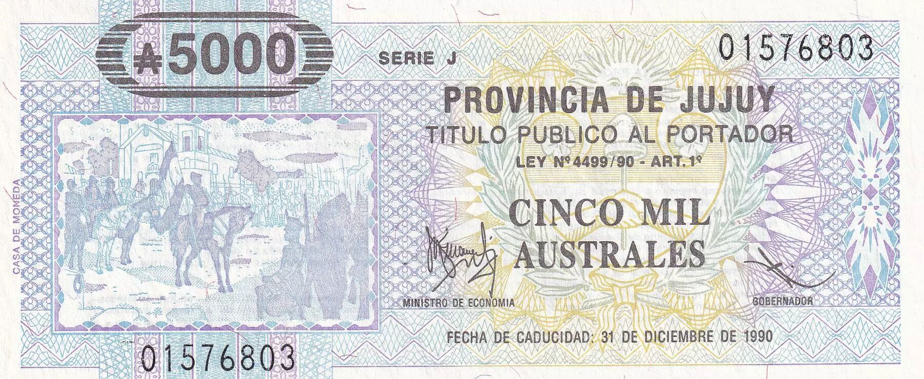 Billet Argentine 5000 Australes - Province de Jujuy - 1990 - Série J - P.S2412