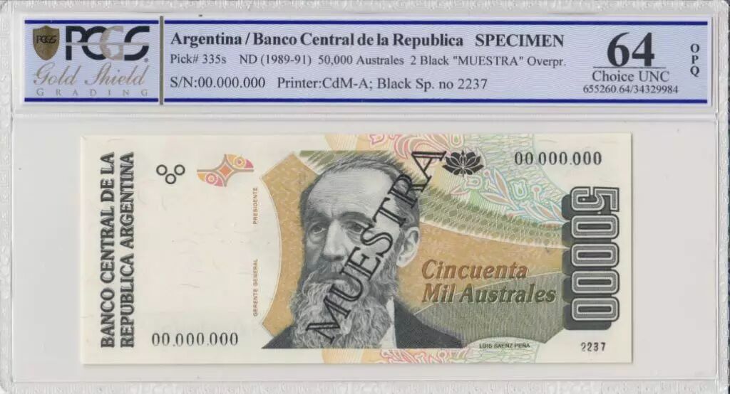 Billet Argentine 50000 Australes , L Saenz Pena - 1989 - Spécimen - PCGS 64 OPQ