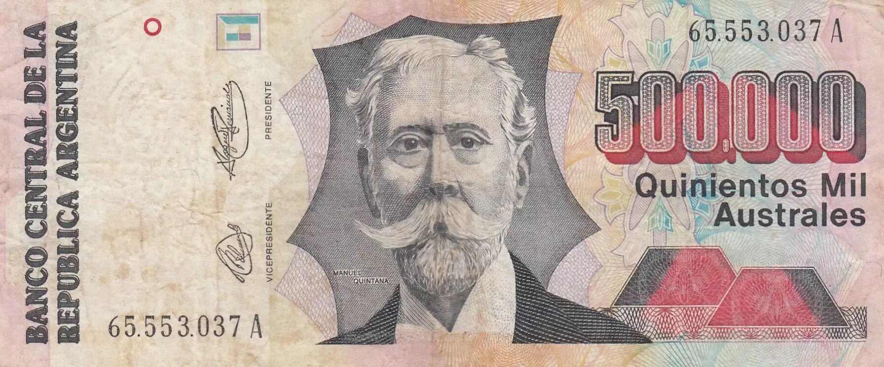 L'avers du billet présente un portrait de Manuel Quintana. On peut lire les inscriptions "BANCO CENTRAL DE LA REPUBLICA ARGENTINA" et "Quinientos Mil Australes". La valeur faciale "500.000" est également mentionnée.