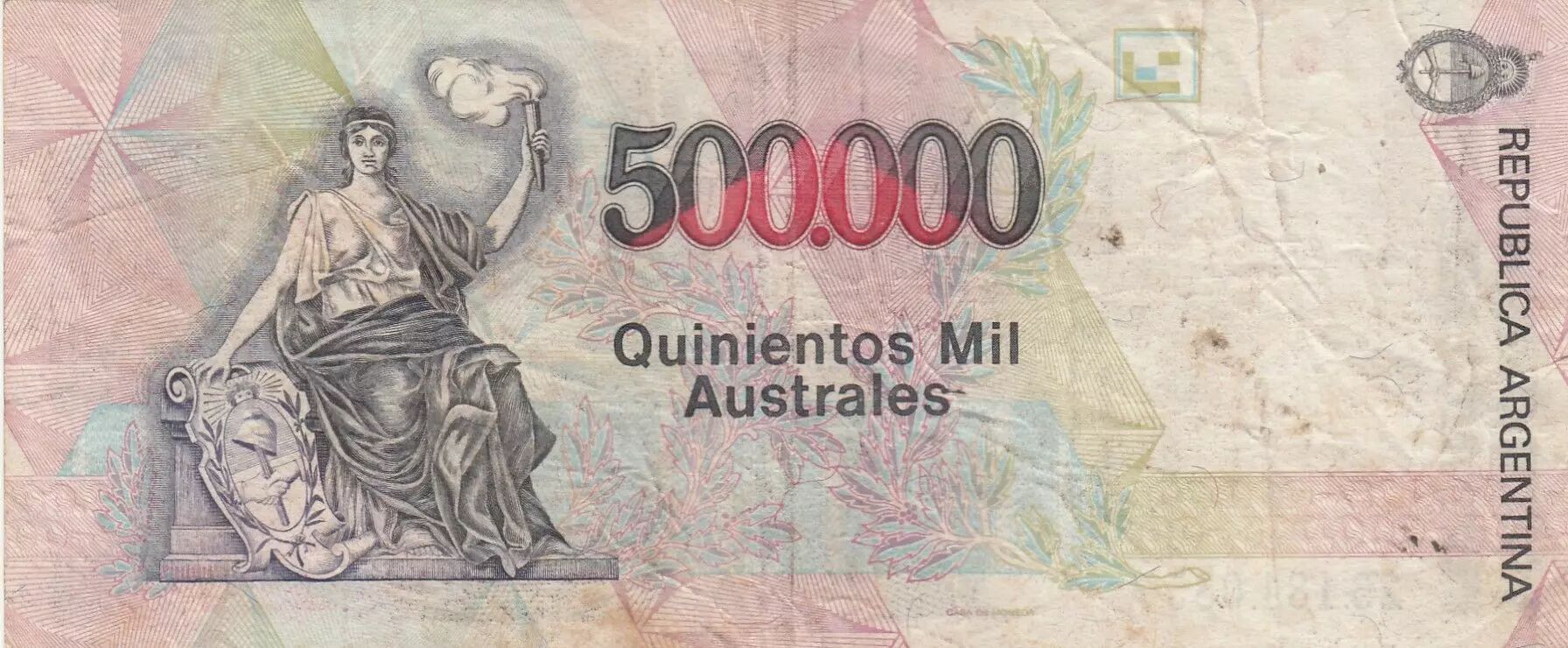 Le revers du billet représente une allégorie de la Liberté (Progreso). Cette figure est représentée assise, tenant un flambeau et un écu. L'inscription "REPUBLICA ARGENTINA" est présente, ainsi que la valeur faciale "500.000" et "Quinientos Mil Australes".