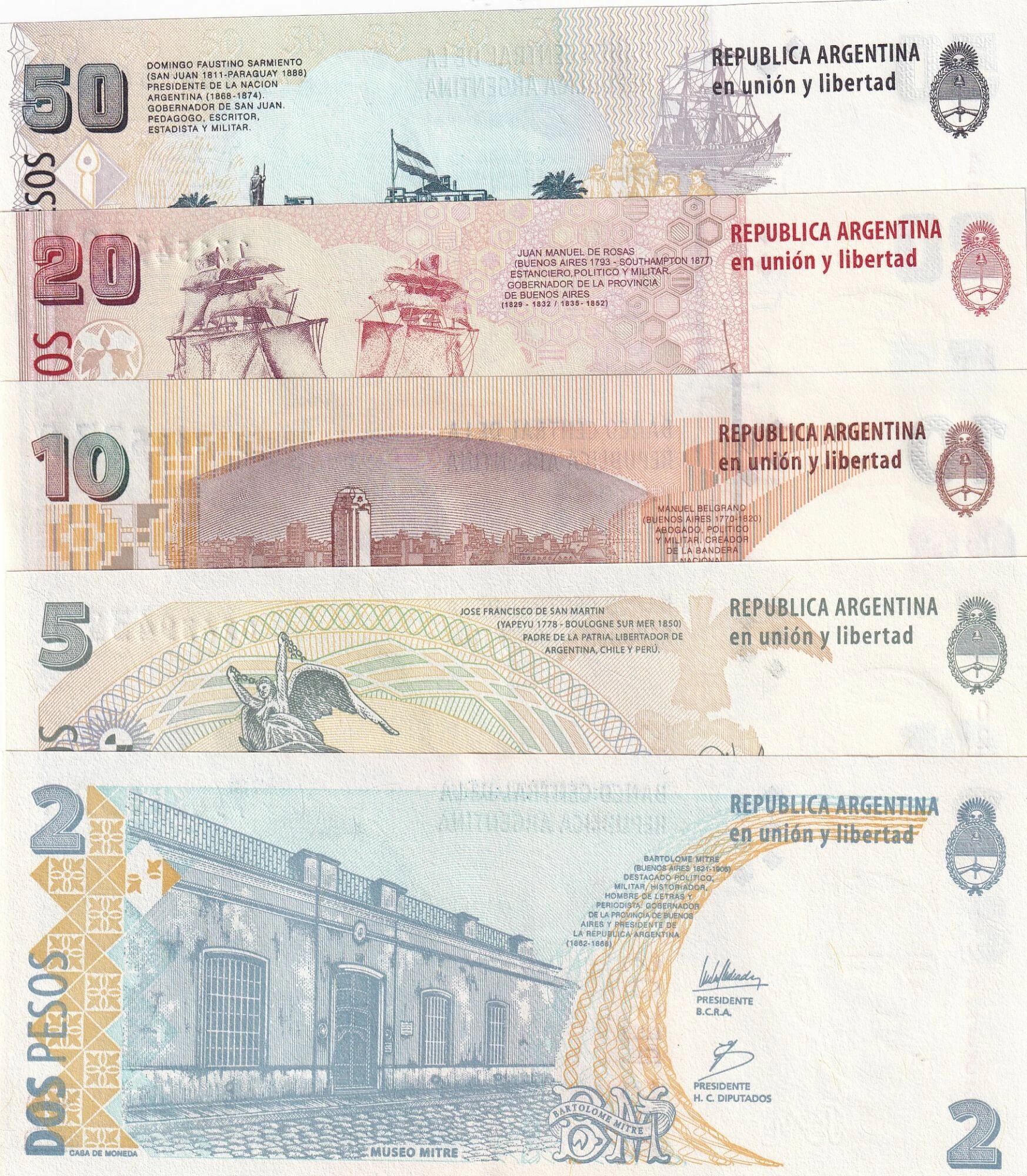 Ce set comprend les billets de 2, 5, 10, 20 et 50 pesos argentins émis entre 2012 et 2016.