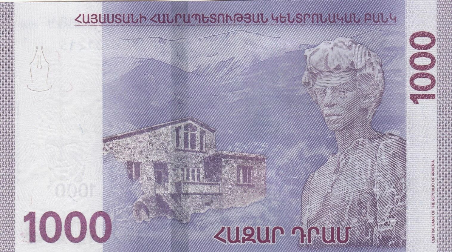 This banknote is an issue from 2022 originating from Armenia. It has a face value of 1000 drams.