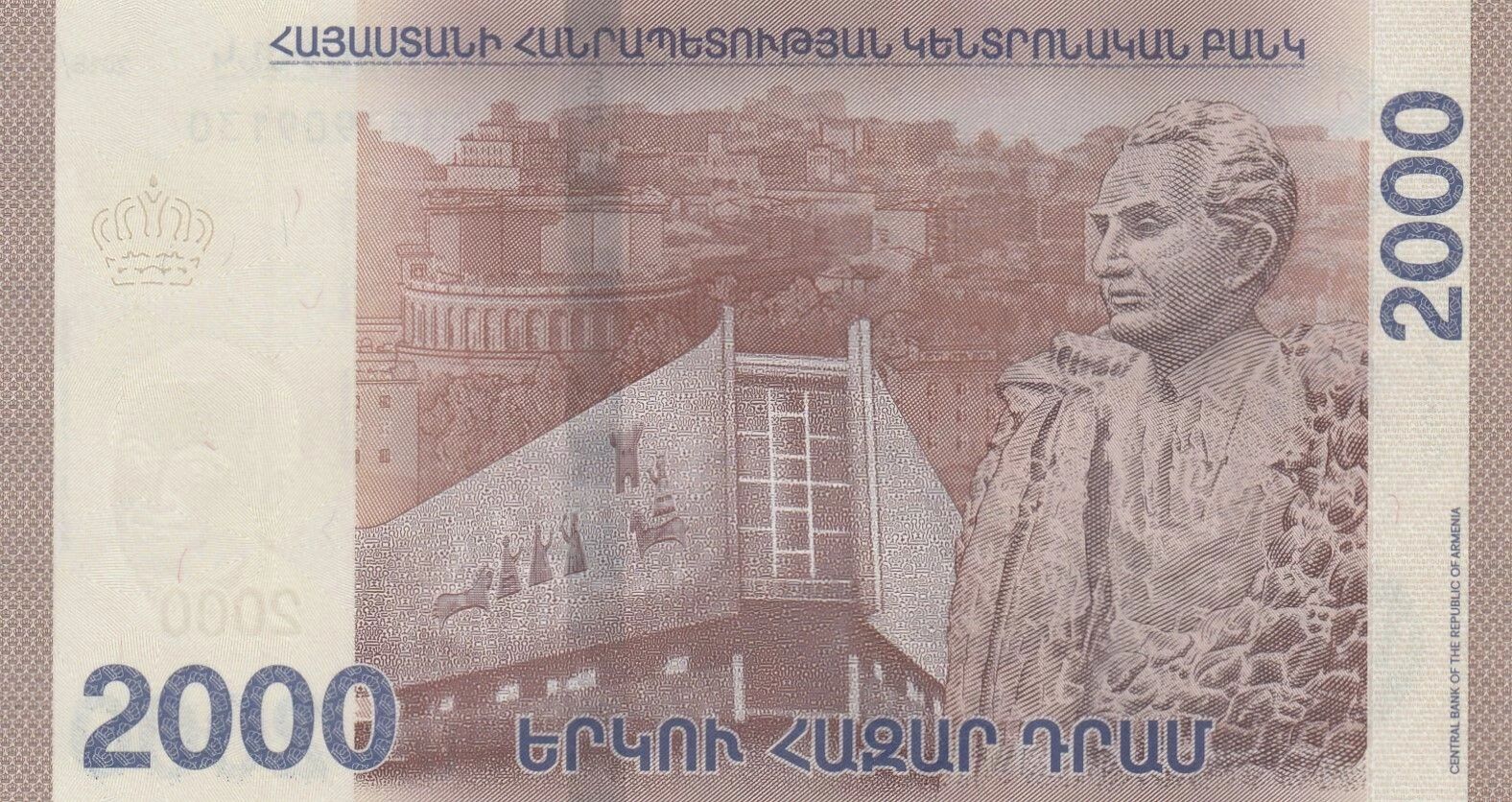 This banknote, issued by Armenia in 2018, has a face value of 2000 drams.