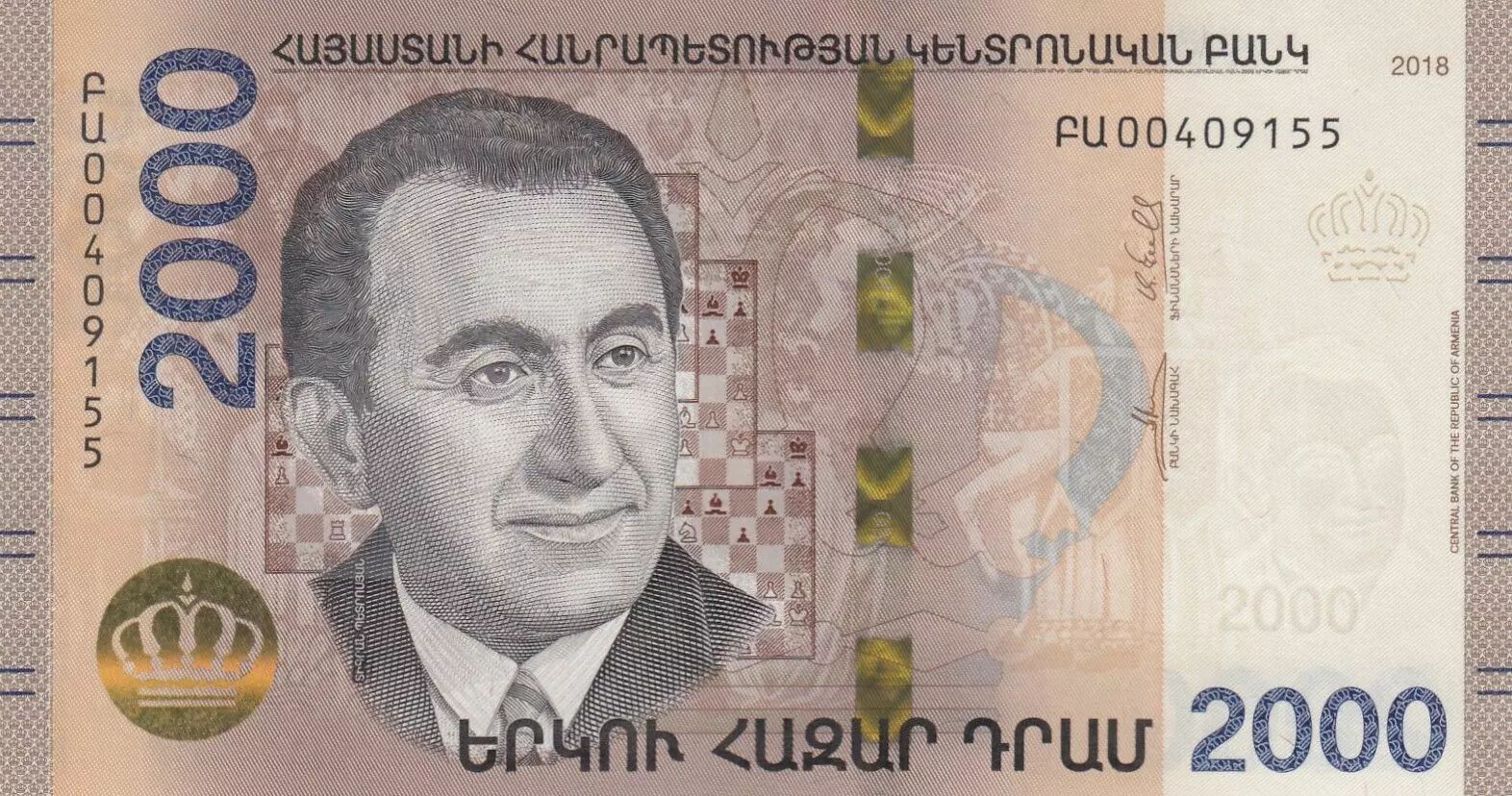 The back of the banknote depicts the monument dedicated to Tigran Petrosian located in Yerevan, as well as the Chess House, with the city of Yerevan in the background. Repeated inscriptions in Armenian and Latin indicate the Central Bank of the Republic of Armenia and the face value of 2000 drams. Suren Simonyan is also the designer of the back. The banknote's watermark reveals a portrait of Tigran Petrosian and the face value in numerals. A transparent crown-shaped window is also integrated into the banknote.