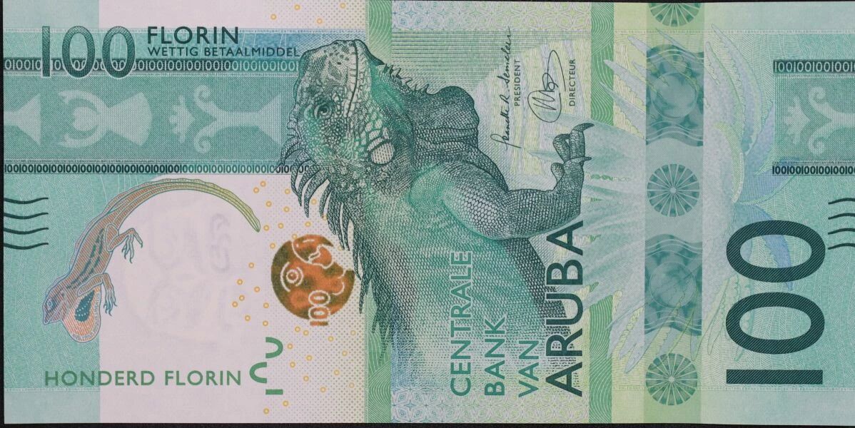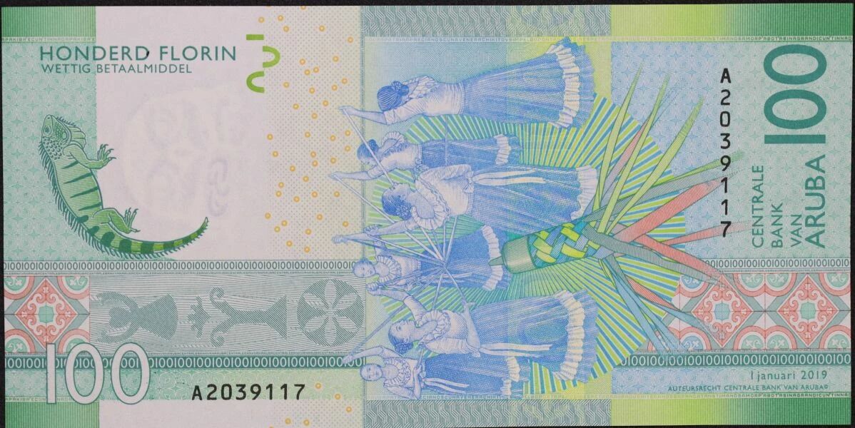 The face value of the banknote is 100 florins, the official currency of Aruba. The banknote's design incorporates distinctive visual elements specific to Aruban iconography.