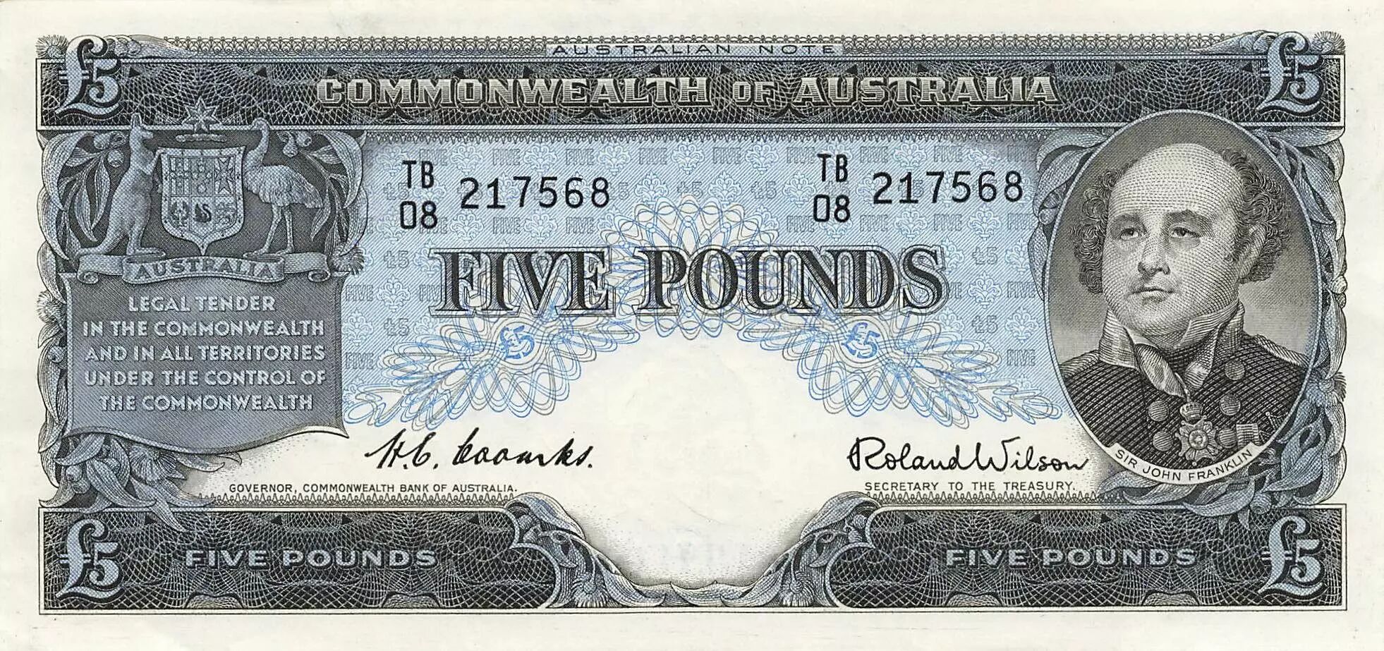 Home > World Banknotes > Oceania Banknotes > Australia > Australia 5 Pounds - Sir John Franklin - ND (1954-1959) - P.31