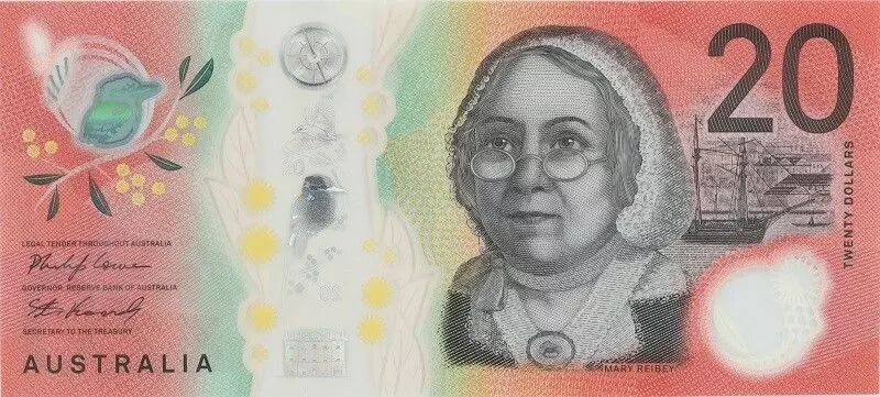 Le recto du billet présente un portrait de Mary Reibey au centre. Mary Reibey, née en 1777 et décédée en 1855, était une femme d'affaires et philanthrope australienne d'origine britannique. Elle est notamment connue pour son parcours exceptionnel, passant d'une condamnation pour vol à une figure respectée de la société coloniale. Sur la droite du portrait de Mary Reibey, on observe une représentation du voilier "Mercury". Des inscriptions en latin figurent également sur cette face du billet, indiquant la valeur nominale, le pays d'émission et la mention "Legal tender throughout Australia".