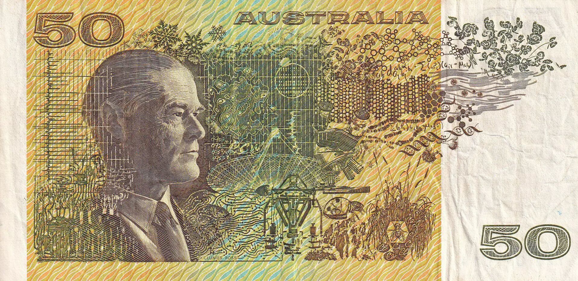 Accueil > Archivage > Australie 50 Dollars - Howard W. Florey - Ian Clunies-Ross - 1989 - TB - P.47g
