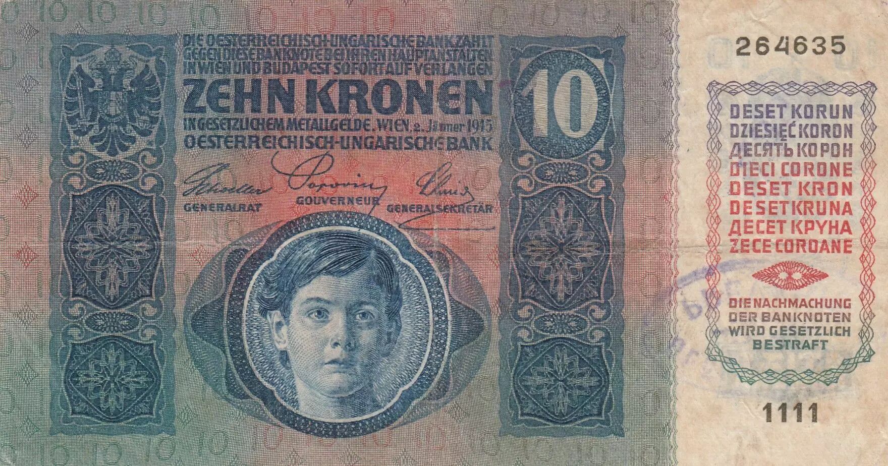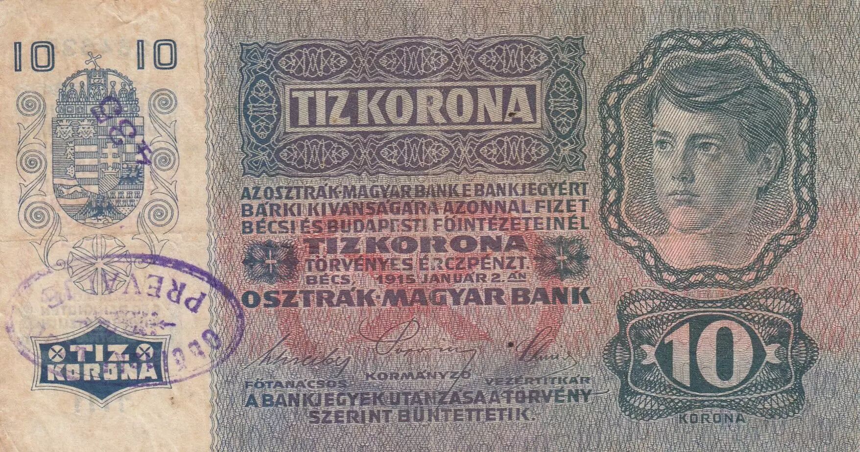 Banknote Austria 10 Kronen 1915 - Overprint purple stamp