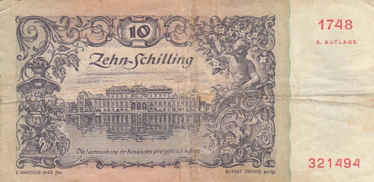 On the front, the banknote features a rider from the Spanish Riding School, appearing in front of the Hofburg, a complex of historical buildings in Vienna. The inscriptions include the face value "10" as well as "Zehn Schilling". The name of the issuing institution, "OESTERREICHISCHE NATIONALBANK", and the date of issue "WIEN, AM 2 JÄNNER 1950" are also present. The terms "PRÄSIDENT", "GENERALRAT" and "GENERALDIREKTOR" are also included, followed by the signature "RUPERT FRANKE inv. et sculp.", indicating that Rupert Franke is both the inventor and sculptor of this motif. The name Franke Rupert is also mentioned as engraver and designer.
