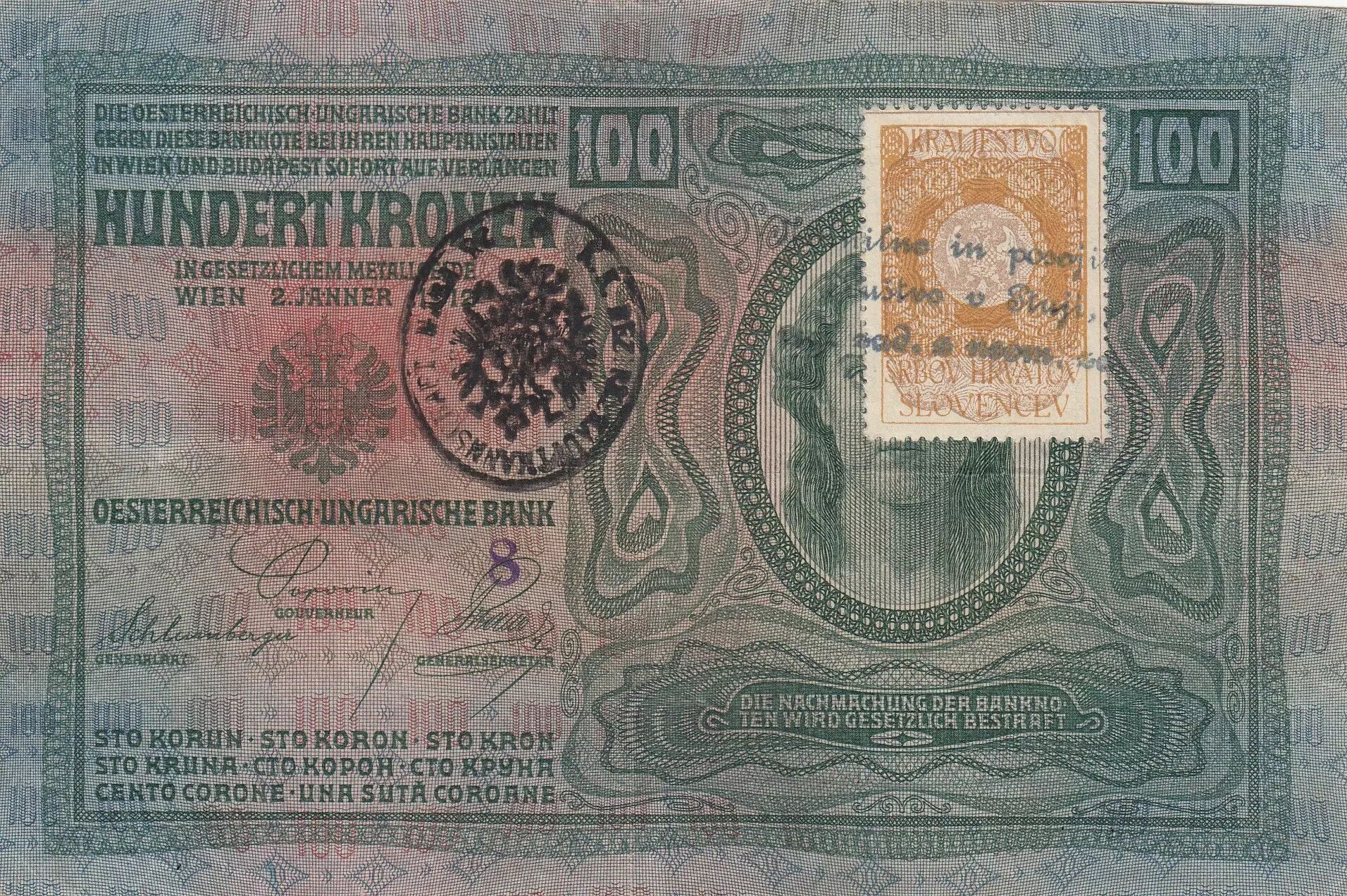 Home > > Austria 100 Kronen 1912 - Overprint with black stamp and postal stamp