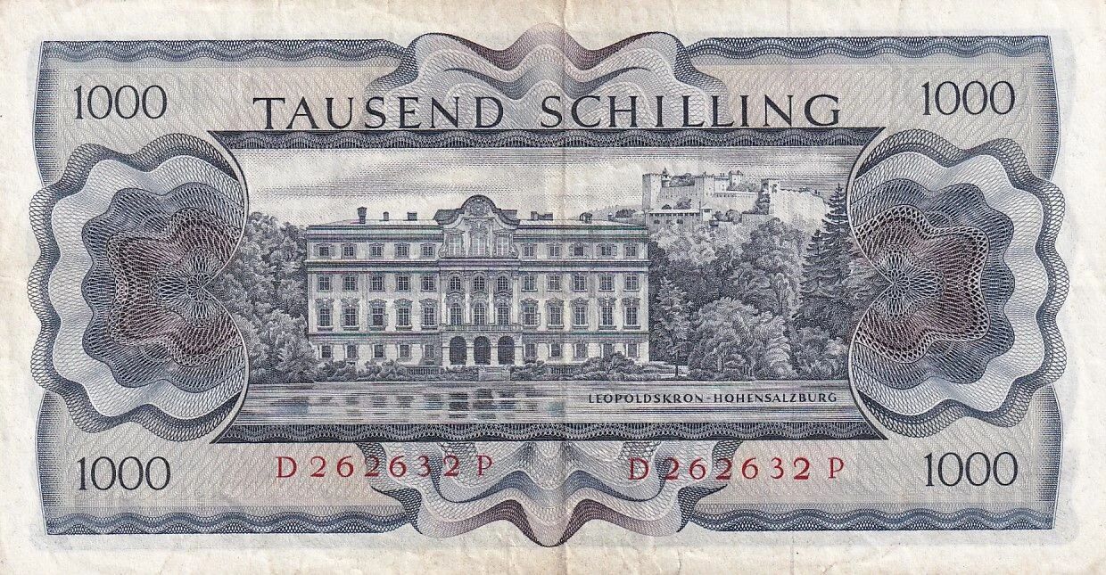 The reverse of the banknote represents a view of Leopoldskron Palace and Hohensalzburg Fortress, located south of Salzburg. The dimensions of the banknote are 159 mm long and 84 mm wide.