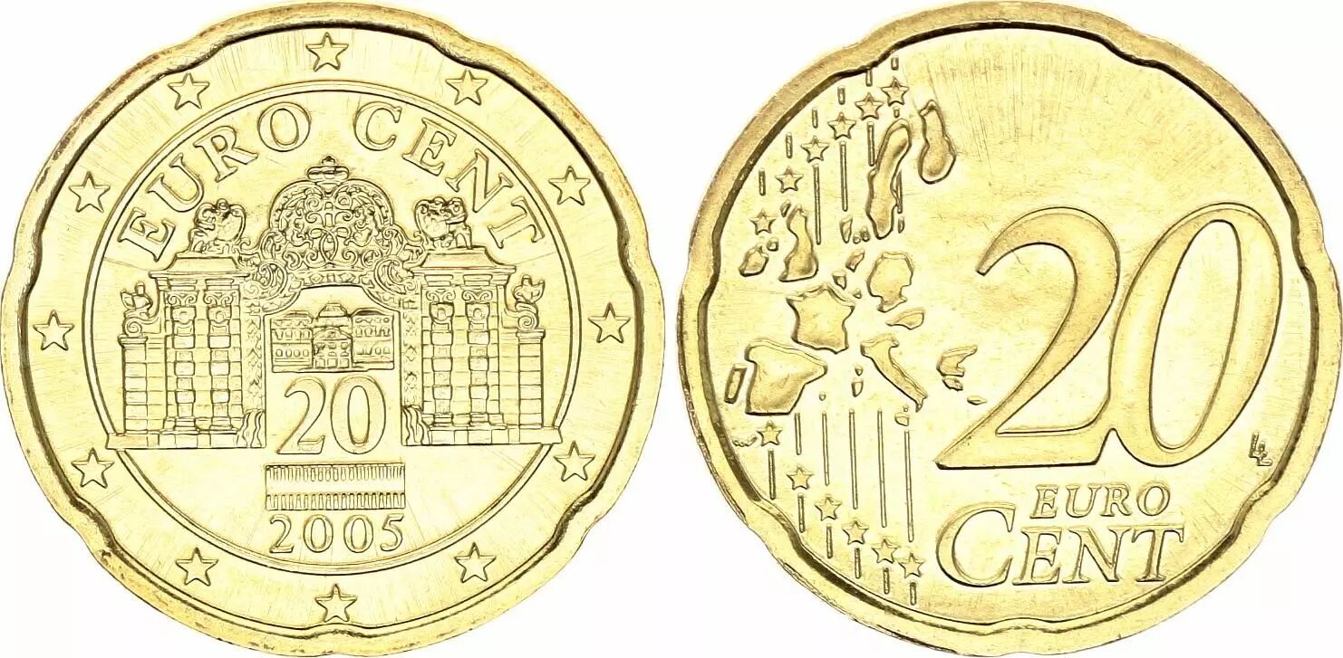 On the common side of the 20-cent coins, there is a representation of Europe, symbolizing the union and shared identity of the member countries of the euro zone. The national side, specific to Austria, may feature monuments, historical figures, or national emblems. The Austrian 2005 20-cent euro coin is a common means of exchange in the euro zone, while bearing a visual identity specific to Austria.