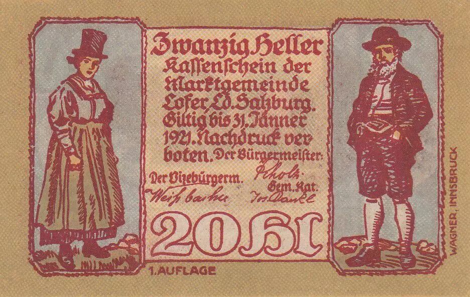 Banknote Austria 20 Heller 1921 - Man and Woman, mountain village - City of Lofer