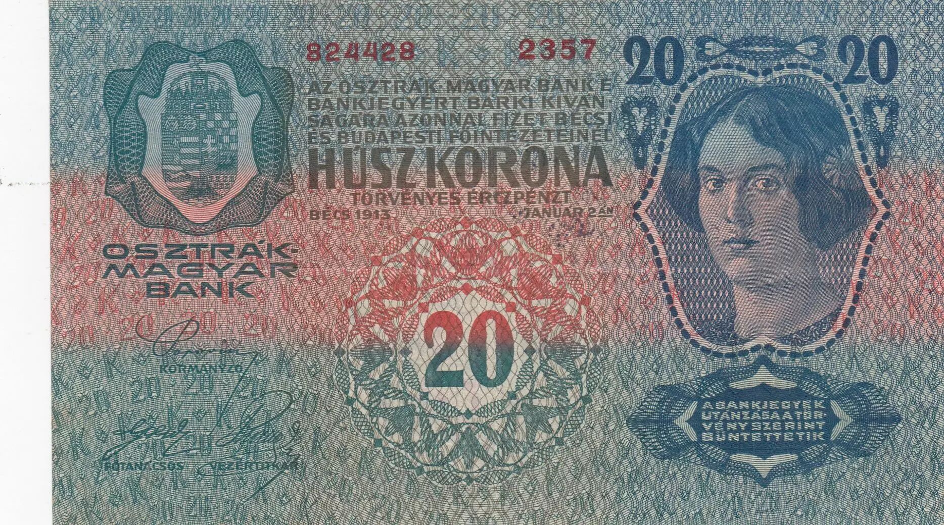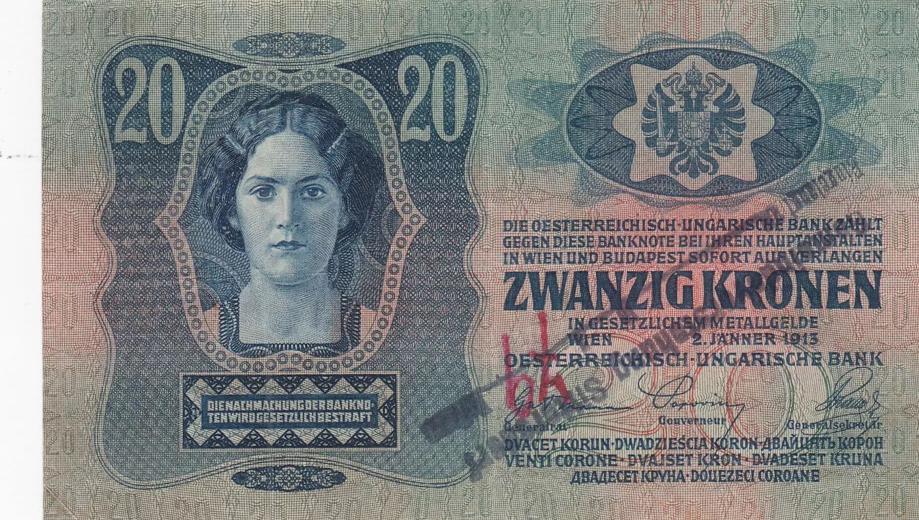 Banknote Austria 20 Kronen 1913 - Overprint with black stamp