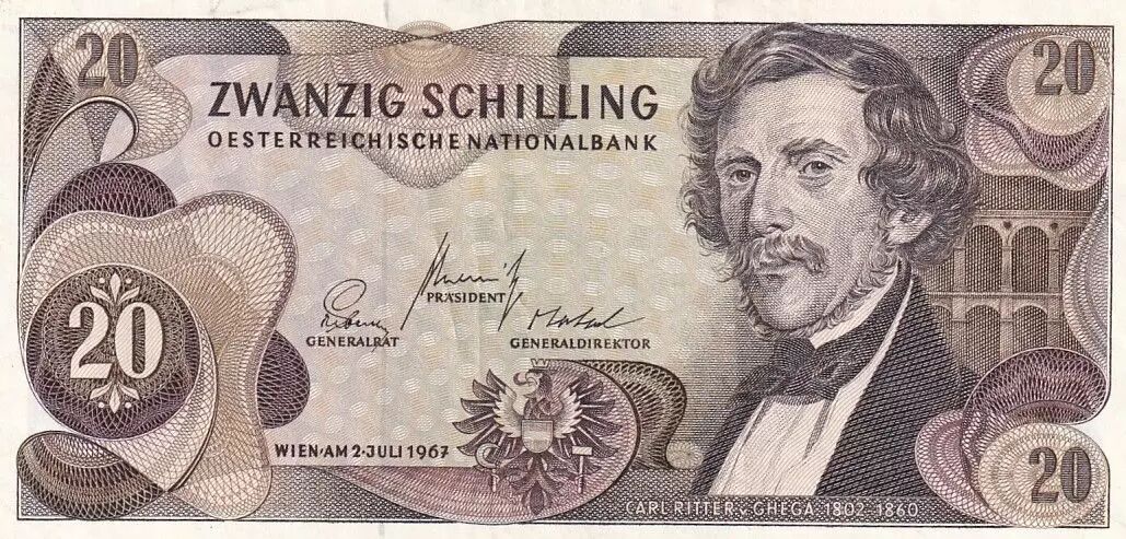 Banknote Austria 20 schilling - Carl Ritter - Serial NU - 1967 - P.142