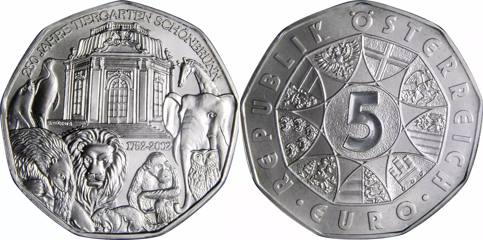 Home > > Austria 5 Euros - Schönbrunn Zoo - Silver- 2002 - Under plastic, without cardboard case.